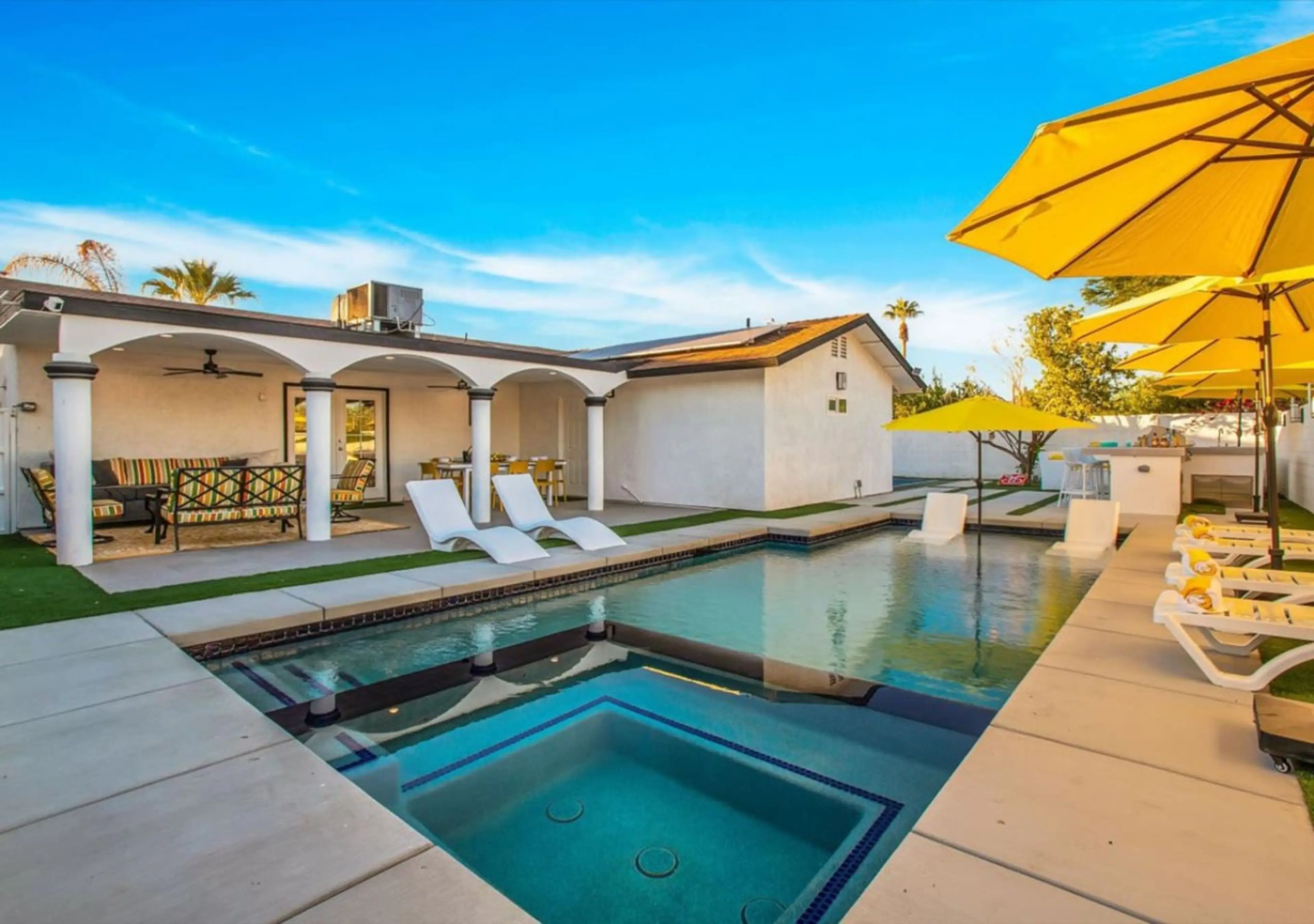 Come enjoy your desert oasis at The Coachella Hide-Away! Conveniently located just a 5 minute drive from Lewis Homes to the Coachella festival grounds, this spacious 5 bedroom, 3 bathroom house is perfect for groups of up to 18 seeking a fun and comfortable stay in the Coachella Valley. Step outsid...